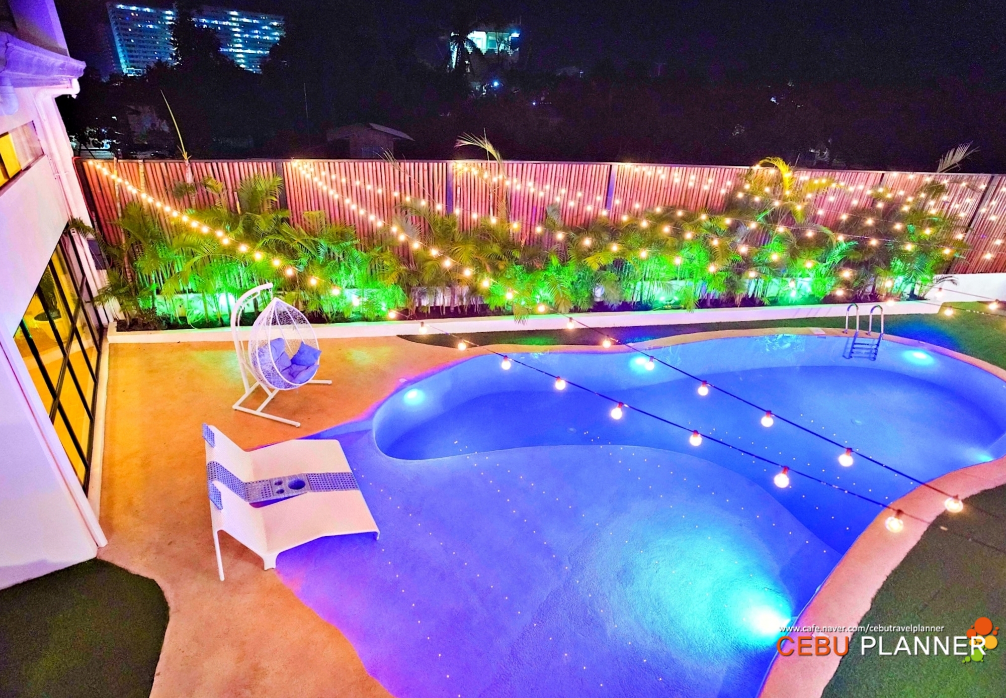 수영장 주변에는 인조잔디가 깔려 있으며 수영장 주변으로는 선베드와 독특한 디자인의 의자들이 있어 여유롭게 휴식도 취하면서 사진 찍기도 참 좋은 숙소입니다.
